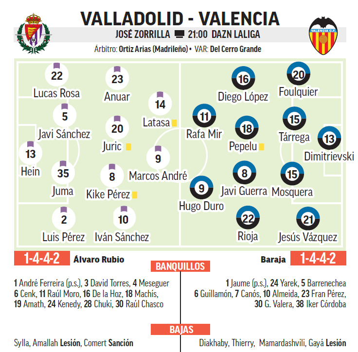 Valladolid y Valencia disputan la primera final de la temporada, y no precisamente para ganar un título. Colista y penúltimo se enfrentan en un momento crítico de la temporada: para los pucelanos, que ya esperan la llegada de Diego Cocca, técnico sustituto de Pezzolano, porque no se pueden dejar más puntos por el camino. Y para los blanquinegros, con el puesto de Baraja tambaleándose, porque quieren evitar tomar una medida drástica con su técnico.