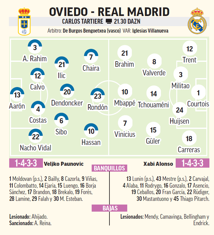 En el Madrid, las atenciones se centran en dos de sus brasileños. La situación de Rodrygo desde la llegada de Xabi Alonso es espinosa. En Oviedo pueden quedar muchas cosas claras con un delantero que, ante Osasuna, fue el único de los seis convocados que no jugó.