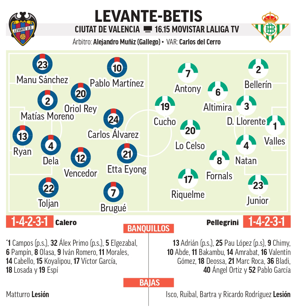 Tras un comienzo de curso por debajo de lo esperado, tanto en juego como en resultados, el equipo de Pellegrini se presenta en el Ciutat de Valencia con aires renovados. Ha recuperado a Abde, que no juega desde la final de la Conference por lesión; también a Pau López tras un golpe que le dejó fuera en Vigo y ante el Athletic; y, sobre todo, incorpora a Antony y Amrabat, dos futbolistas de talla mundial que deben darle un gran impulso a los verdiblancos. Bartra y Ricardo Rodríguez se lo pierden por lesión.