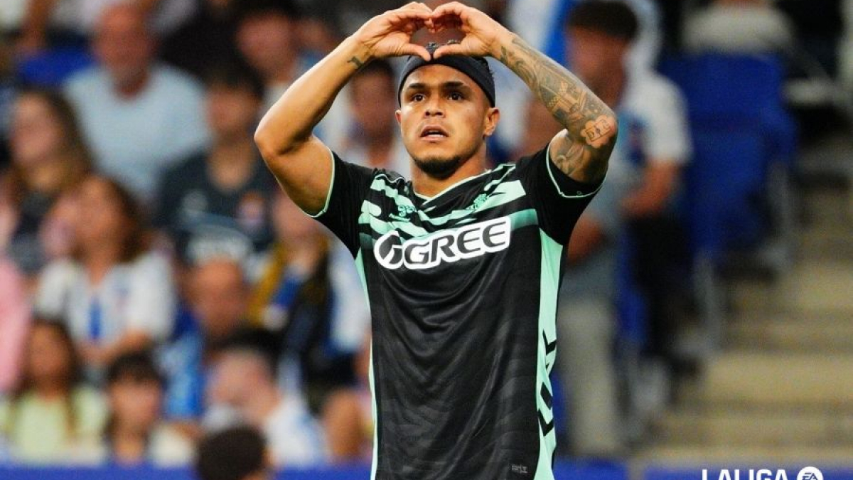 El delantero del Betis Cucho Hernández ha sido uno de los grandes protagonistas de la victoria del Betis en Cornellá con un soberbio testarazo en escorzo que suponía el empate.