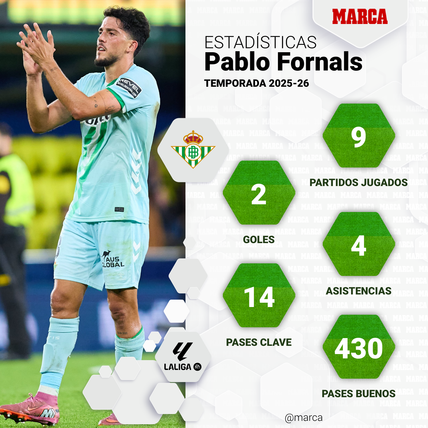 Cuando le toca jugar unos metros más atrás, ya sea de inicio o retrasando su posición durante los partidos con los cambios, Fornals saca a relucir su clarividencia para darle orden al juego de su equipo y una salida limpia del balón desde atrás. Está a un paso del top 15 de jugadores con más pases acertados en Primera esta temporada (430 en nueve partidos), candidato a mejor jugador del mes de septiembre en LaLiga y con unas estadísticas siguen creciendo al tiempo que el Betis mira hacia arriba y toma posiciones… mientras aguarda el regreso de Isco. Hasta entonces, Pablo es quien marca el camino.
