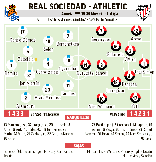 Otra cosa positiva para el conjunto txuriurdin es que lleva ocho derbis sin caer de local, así que esta tarde buscará alargar la racha a nueve con un triunfo, un objetivo para el que recupera a Take Kubo, baja en esos tres partidos citados. El japonés apunta a estar de inicio en el banquillo, porque Guedes ha ido a más en su rendimiento ocupando su lugar. El portugués es uno de los que debe ayudar a Oyarzabal, protagonista con sus goles de las cinco victorias más recientes de su equipo. Además, el Athletic es al que más veces ha goleado en su carrera, ocho.