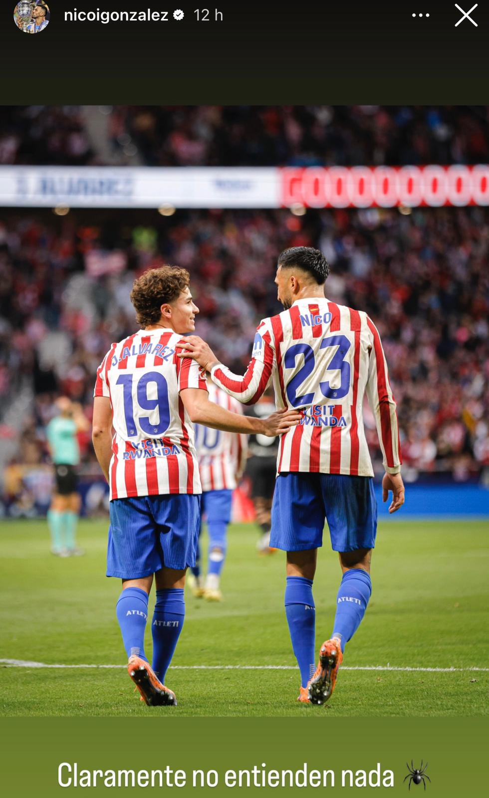 Un descontento que también quiso expresar en sus redes sociales Nico Gonzalez. El compañero de Julián en el Atlético y en la Selección argentina publicaba una foto junto al 19 rojiblanco y la frase «Claramente no entienden nada» y un emoticono de una araña. La ausencia del internacional argentino en listado con claro dominio del PSG y en el que aparecen nombres como Retegui, Al Dawsari, Henrique, Pedro o leyendas como Cristiano y Messi resulta cuanto menos, llamativa. ¿Dónde está Spider-Man?