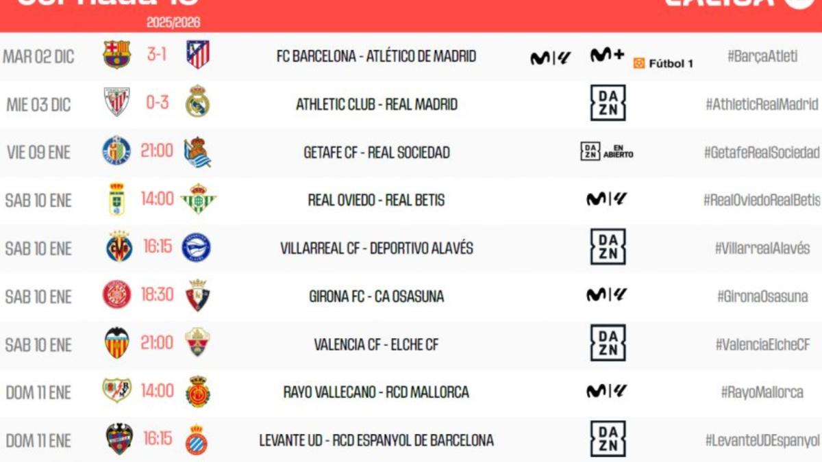 La jornada 19 empezará con el Getafe-Real Sociedad que tendrá lugar el viernes 9 de enero. El sábado, Valencia y Elche cerrarán los partidos de ese día y el domingo, apenas habrá dos partidos: Rayo-Mallorca y Levante-Espanyol.