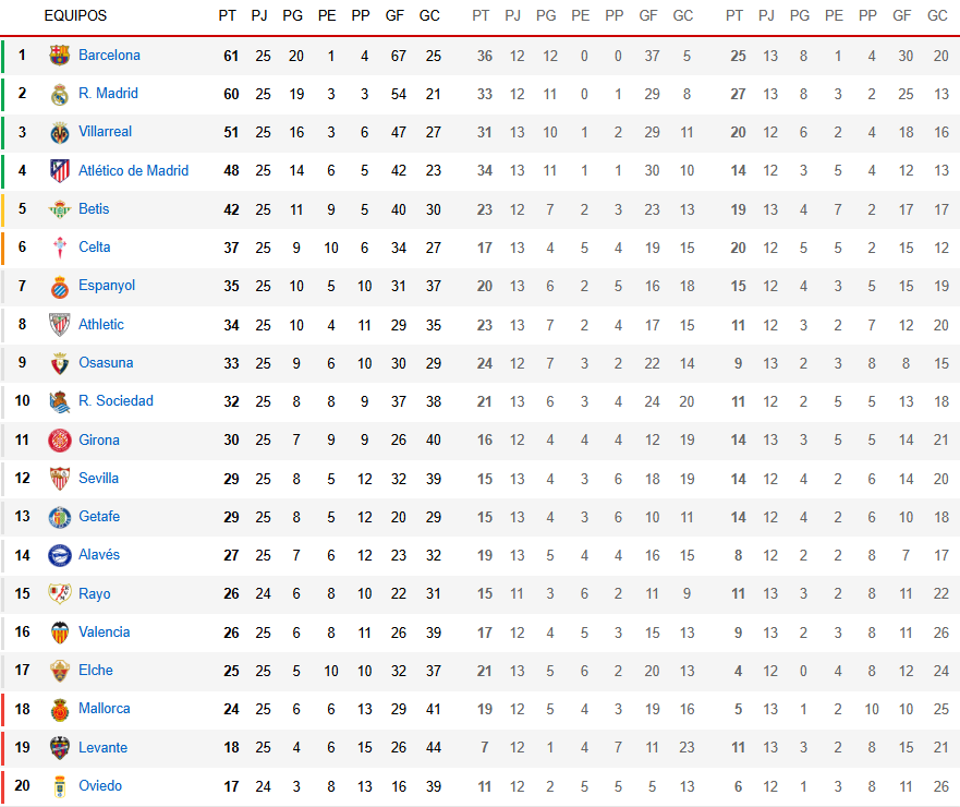 El Rayo yel Oviedo se sitúan en la zona baja de la tabla clasificatoria. Los de Íñigo Pérez ocupan la decimoquinta posición tras el empate ante el Betis en La Cartuja y la contundente victoria por 3-0 frente al Atlético de Madrid en Butarque. Se encuentran a tan solo dos puntos del descenso, que marca el Mallorca con 24 unidades.