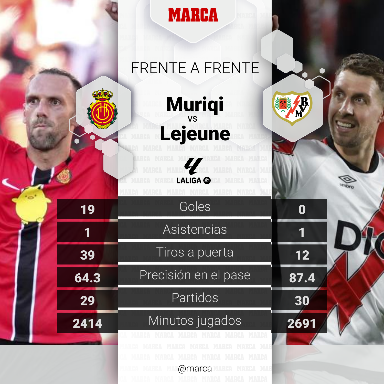 El duelo del partido:Muriqi vs Lejeune. Duelo de altura en el área del Rayo, que defenderá Cárdenas tras las molestias de Batalla en Conference. De la experiencia del central francés para tapar y molestar al kosovar dependerán muchas de las opciones del Rayo de puntuar en Mallorca. Pero el Pirata tiene cada vez más cerca a Mbappé en el Pichichi, ha olido sangre y es peligrosísimo. Habrá pelea bonita entre ambos.