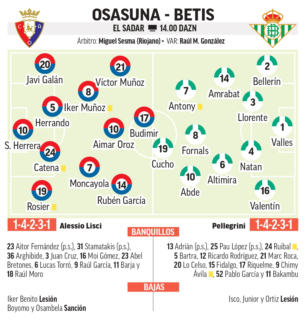 El conjunto dirigido por Alessio Lisci buscará volver a sumar de tres en El Sadar, convertido como ode costumbre en un auténtico fortín. Para ello, tendrá que afrontar el duelo sin los sancionados Osambela y Boyomo, por lo que se espera a una pareja de centrales formada por Catena y Herrando. También tratará de aumentar la espectacular racha de 35 encuentros seguidos marcando en casa en la competición liguera, una proeza que comenzó tras un 0-2 en 2024, curiosamente en un partido frente al Betis.