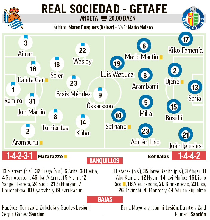 La Real Sociedad apenas ha tenido tiempo para recuperarse de la final de Copa del Rey la posterior fiesta por el título. Se enfrenta al Getafe, un equipo que se caracteriza por llevar los partidos al límite en lo físico y que pelea por un puesto europeo.
